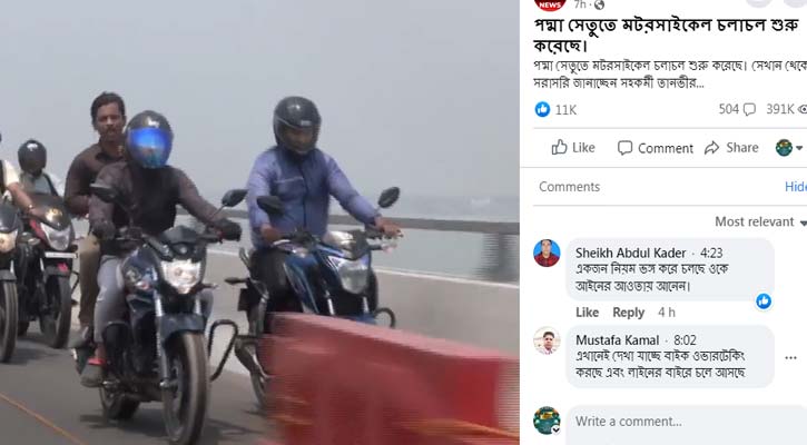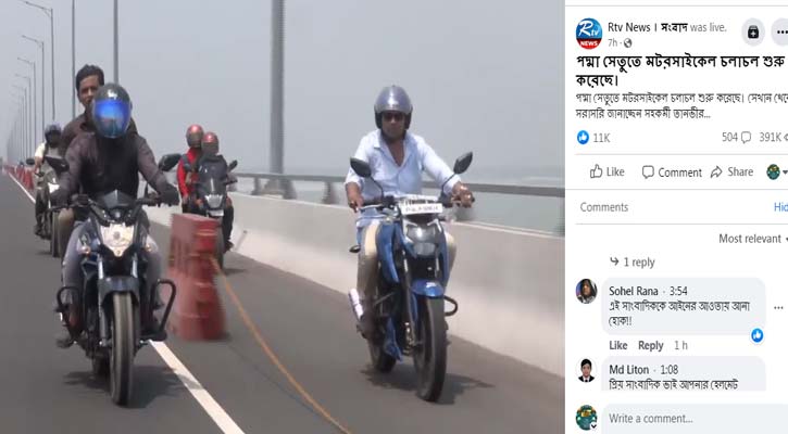 তবে প্রথম দিনেই সরকারের নির্দেশনা অমান্য করেছেন একটি বেসরকারি টেলিভিশন চ্যানেলের সাংবাদিক। পদ্মা সেতুতে মোটরসাইকেল চড়ে লাইভ প্রতিবেদন করছিলেন তিনি। এসময় তার মাথায় কোনো হেলমেট ছিলো না। অথচ নির্দেশনায় বলা আছে, মোটরসাইকেল চালক ও আরোহী দুজনকেই মানসম্মত হেলমেট পরিধান করতে হবে। যদিও এক পর্যায়ে প্রতিবেদককে বলতে শোনা যায়, ‘আমরা আসলে লাইভে আছি, লাইভে থাকার কারণে হেলমেট পরিধান করা সম্ভব হয়নি। আমাদের কাছে হেলমেট সংরক্ষিত আছে’।