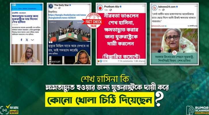 ৫ আগস্ট ক্ষমতাচ্যুত হয়ে ভারতে আশ্রয় নেওয়ার পর শেখ হাসিনা দিল্লি থেকে জনগণের উদ্দেশে একটি খোলা চিঠি দিয়েছেন এবং ওই চিঠিতে তার ক্ষমতাচ্যুত হওয়ার জন্য যুক্তরাষ্ট্রকে দায়ী করেছেন দাবিতে ভারতীয় গণমাধ্যমে একটি তথ্য ছড়িয়ে পড়ে।