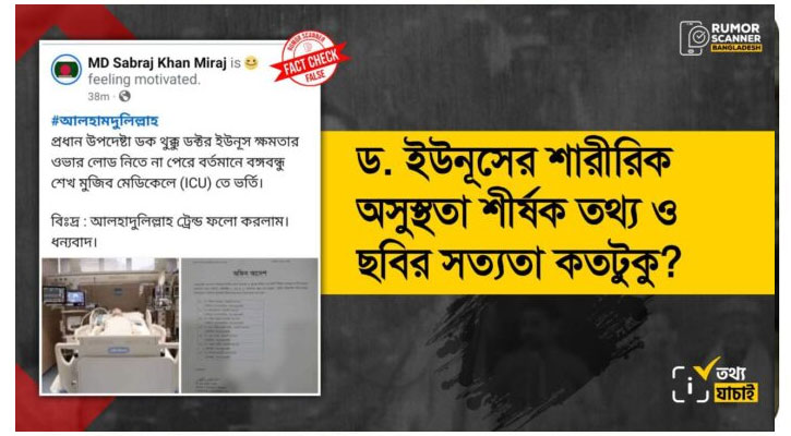 ৩) ড. মুহাম্মদ ইউনূস আইসিইউতে ভর্তি হওয়ার ভুয়া খবর।