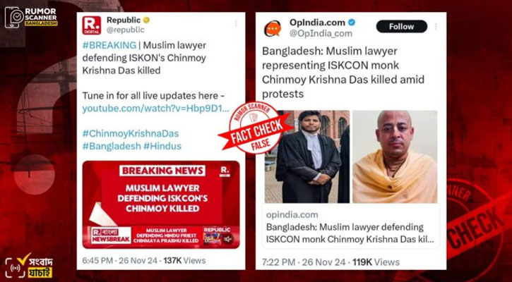রিউমার স্ক্যানার জানায়, এই দাবি সঠিক নয়। চিন্ময়ের আইনজীবী শুভাশীষ শর্মা, সাইফুল ইসলাম নন।