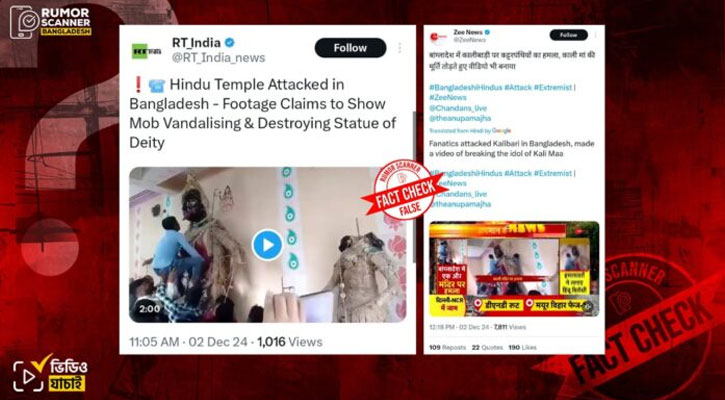 রিউমর স্ক্যানারের অনুসন্ধানে জানা যায়, ভিডিওটি বাংলাদেশে নয়, বরং ভারতের পূর্ব বর্ধমান জেলার খণ্ডঘোষ সুলতানপুর গ্রামে প্রতিমা বিসর্জনের দৃশ্য। ভিডিওটি বাংলাদেশের হিন্দু মন্দিরে হামলার সঙ্গে সম্পর্কিত নয়।