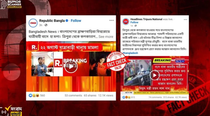 বাংলাদেশের ব্রাহ্মণবাড়িয়ায় ঢাকা-আগরতলা-ঢাকা রুটে শ্যামলী পরিবহনের একটি বাসের সাথে বাংলাদেশি ট্রাকের সংঘর্ষ ঘটানোর দাবিতে ভারতের কিছু গণমাধ্যমে সংবাদ প্রচারিত হয়। আরও দাবি করা হয়, শ্যামলী পরিবহনের বাসে থাকা ভারতীয় যাত্রীদের স্থানীয়রা প্রাণনাশের হুমকি দেয় এবং ভারতবিরোধী স্লোগান দেয়।