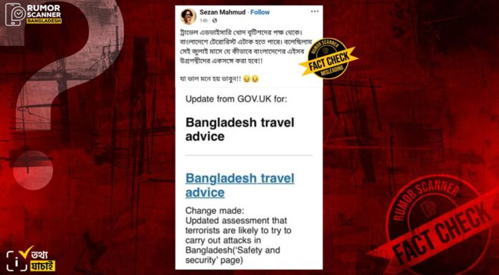 বাংলাদেশে যেকোনো সময় জঙ্গি হামলা হতে পারে জানিয়ে যুক্তরাজ্য ভ্রমণ সতর্কতা দিয়েছে দাবিতে একটি তথ্য ভারতীয় কিছু গণমাধ্যম প্রচারিত হয়েছে। তবে যুক্তরাজ্যের ভ্রমণ সতর্কতা কেবল বাংলাদেশে নয় বরং ভারত, ইন্দোনেশিয়া, জার্মানি, স্পেন, শ্রীলঙ্কা, ফ্রান্সসহ বিশ্বের অনেক দেশের ক্ষেত্রেই একই ভ্রমণ সতর্কতা অনেকদিন ধরেই জারি করে রেখেছে যুক্তরাজ্য। তাই, এককভাবে বাংলাদেশকে নিয়ে প্রচারণা বিভ্রান্তিকর। তাছাড়া, যুক্তরাজ্য সাধারণত কোনো অঞ্চলে ভ্রমণ সতর্কতা জারি করলে তা সবার জন্য প্রযোজ্য হয়। এবার সহিংসতার কারণে বিশেষভাবে পার্বত্য চট্টগ্রামে সতর্কতা জারি করা হলেও দেশের অন্য জেলাগুলোতে এ ধরনের বিশেষ কোনো সতর্কতা আরোপ করা হয়নি। পাশাপাশি, যুক্তরাজ্যের ভ্রমণ সতর্কতা অনুযায়ী, বাংলাদেশের চেয়ে ভারত, ফ্রান্স, জার্মানি, রাশিয়া, যুক্তরাষ্ট্র, পাকিস্তানের মতো দেশে জঙ্গি হামলার সম্ভাবনা বেশি।