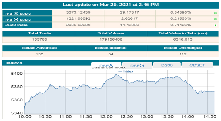 জানা গেছে, ডিএসই ব্রড ইনডেক্স আজ ২৯ পয়েন্ট বেড়ে অবস্থান করছে ৫ হাজার ৩৩৭ পয়েন্টে। আর ডিএসই শরিয়াহ সূচক ২ পয়েন্ট বেড়ে অবস্থান করছে ১ হাজার ২২১ পয়েন্টে এবং ডিএসই–৩০ সূচক ১৪ পয়েন্ট বেড়ে অবস্থান করছে ২ হাজার ৩৬ পয়েন্টে।