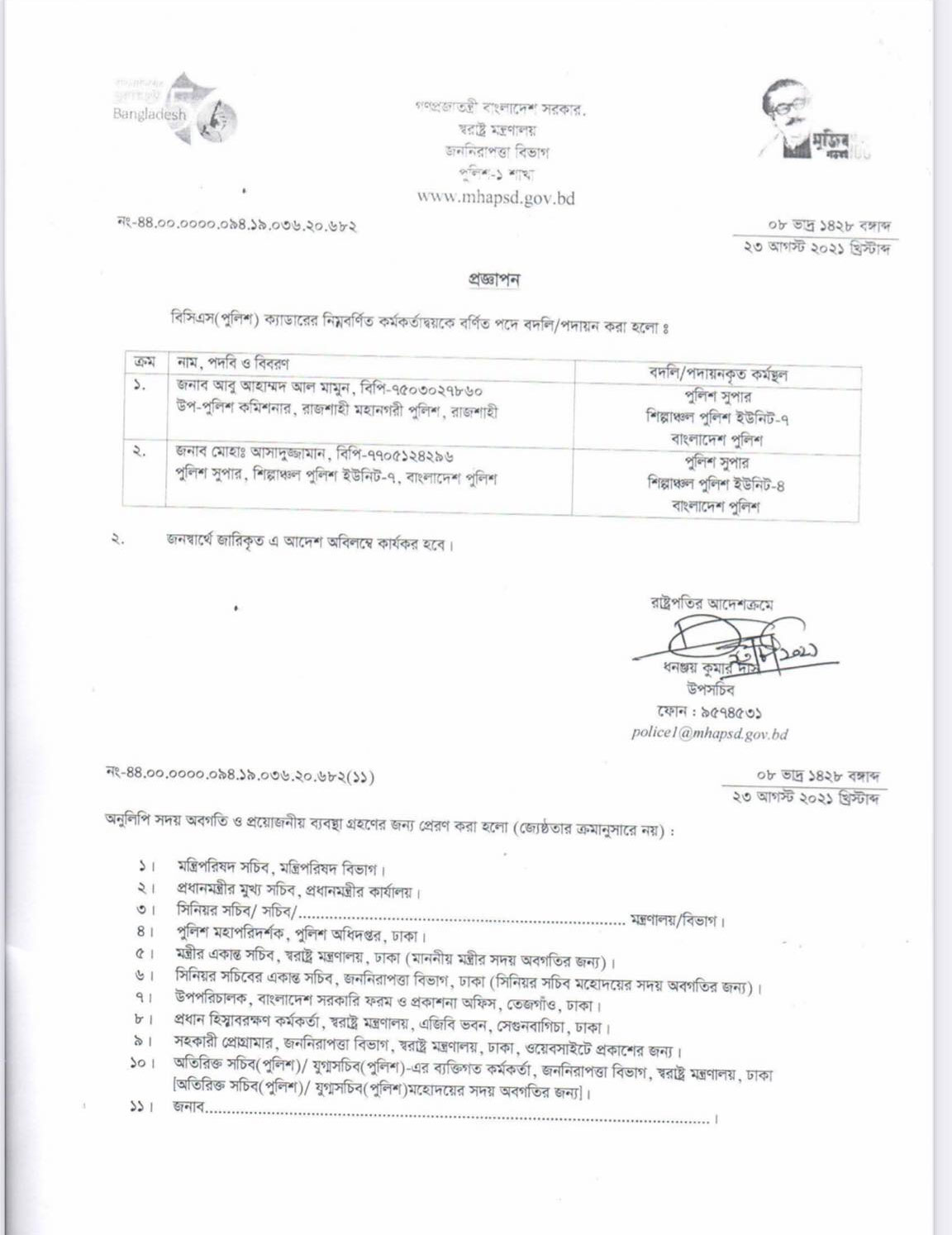 এসপি পদমর্যাদার যে দুই কর্মকর্তাকে পদায়ন ও বদলি করা হয়েছে তারা হলেন, রাজশাহী মহানগর পুলিশের উপ পুলিশ কমিশনার আবু আহম্মদ আল মামুন, তাকে শিল্পাঞ্চল পুলিশ ইউনিট-৭ এর পুলিশ সুপার এবং শিল্পাঞ্চল পুলিশ ইউনিট-৭ এর পুলিশ সুপার আসাদুজ্জামানকে শিল্পাঞ্চল পুলিশ ইউনিট-৪ এর পুলিশ সুপার হিসেবে পদায়ন করা হয়েছে।