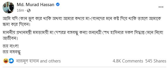 ফেসবুকে দেওয়া ওই স্ট্যাটাসে মুরাদ বলেন, ‘আমি যদি কোন ভুল করে থাকি অথবা আমার কথায় মা-বোনদের মনে কষ্ট দিয়ে থাকি তাহলে আমাকে ক্ষমা করে দিবেন।’