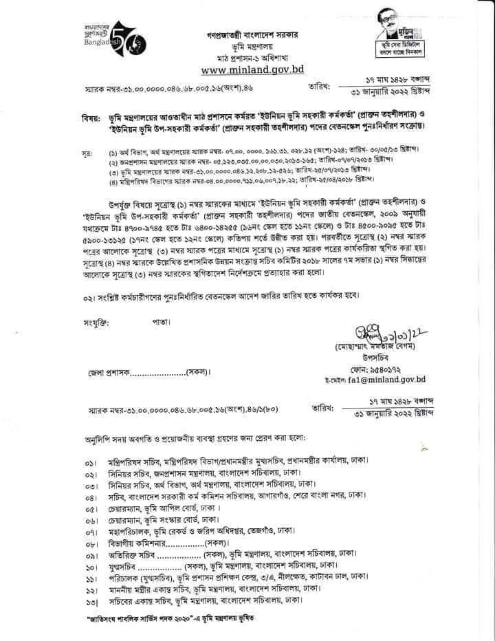 ঢাকা: ভূমি মন্ত্রণালয়ের আওতাধীন মাঠ প্রশাসনে কর্মরত ‘ইউনিয়ন ভূমি সহকারী কর্মকর্তা’ (প্রাক্তন তহশীলদার) এবং ‘ইউনিয়ন ভূমি উপ-সহকারী কর্মকর্তা’ (প্রাক্তন সহকারী তহশীলদার) পদের বেতনস্কেল পুনর্নিধারণ করেছে সরকার।