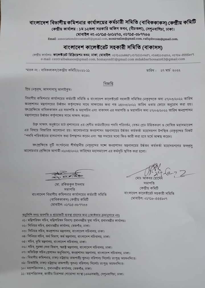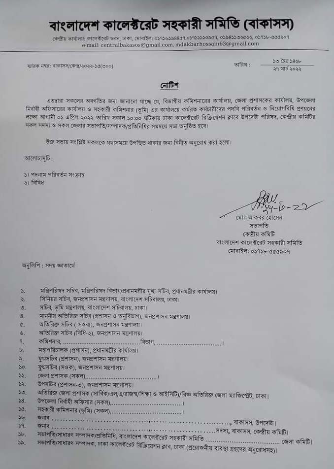 এতে বলা হয়েছে, এতদ্বারা সকলের অবগতির জন্য জানানো যাচ্ছে যে, বিভাগীয় কমিশনারের কার্যালয়, জেলা প্রশাসকের কার্যালয়, উপজেলা নির্বাহী অফিসারের কার্যালয় ও সহকারী কমিশনার (ভূমি) এর কার্যালয়ে কর্মরত কর্মচারীদের পদবি পরিবর্তন ও নিয়োগবিধি প্রণয়নের লক্ষ্যে আগামী ০১ এপ্রিল ২০২২ তারিখ সকাল ১০:০০ ঘটিকায় ঢাকা কালেক্টরেট রিক্রিয়েশন ক্লাবে উপদেষ্টা পরিষদ, কেন্দ্রীয় কমিটির সকল সদস্য ও সকল জেলার সভাপতি/সম্পাদক/প্রতিনিধির সমন্বয়ে সভা অনুষ্ঠিত হবে।