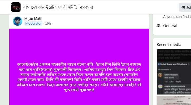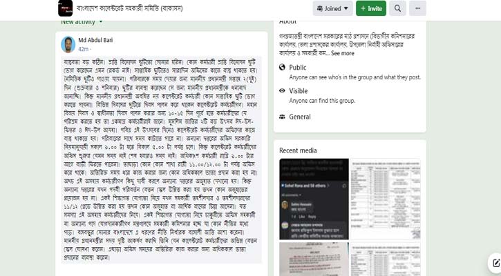 ‘অন্যান্য দপ্তরের অফিস সরকারি নিয়মানুযায়ী সকাল ৯ টা হতে বিকাল ৫ টা পর্যন্ত চলে। কিন্তু কালেক্টরেট কর্মচারীদের অফিস শুরুর যেমন সময় নাই শেষ হবারও সময় নাই। অধিকাংশ কর্মচারী রাত্রি ৯ টার আগে বাড়ি ফিরতে পারে না। তাছাড়া কোন কোন শাখা রাত্রী ১১/১২ টা পর্যন্ত অফিস করে থাকে। অতিরিক্ত সময় ধরে কাজ করার জন্য কোন অধিককাল ভাতা প্রদান করা হয় না।’