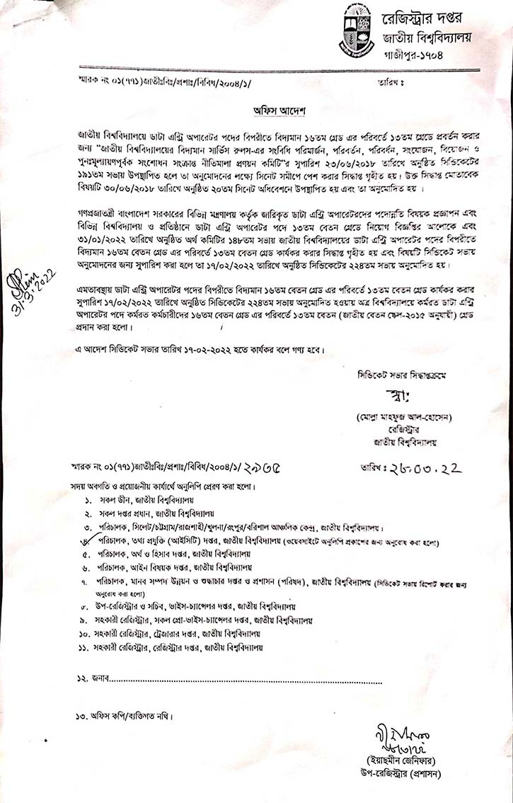 গণপ্রজাতন্ত্রী বাংলাদেশ সরকারের বিভিন্ন মন্ত্রণালয় কর্তৃক জারিকৃত ডাটা এন্ট্রি অপারেটরদের পদোন্নতি বিষয়ক প্রজ্ঞাপন এবং বিভিন্ন বিশ্ববিদ্যালয় ও প্রতিষ্ঠানে ডাটা এন্ট্রি অপারেটর পদে ১৩তম বেতন গ্রেডে নিয়োগ বিজ্ঞপ্তির আলোকে এবং ৩১/০১/২০২২ তারিখে অনুষ্ঠিত অর্থ কমিটির ১৪৮তম সভায় জাতীয় বিশ্ববিদ্যালয়ের ডাটা এন্ট্রি অপারেটর পদের বিপরীতে বিদ্যমান ১৬তম বেতন গ্রেড এর পরিবর্তে ১৩তম বেতন গ্রেড কার্যকর করার সিদ্ধান্ত গৃহীত হয় এবং বিষয়টি সিন্ডিকেট সভায় অনুমোদনের জন্য সুপারিশ করা হলে তা ১৭/০২/২০২২ তারিখে অনুষ্ঠিত সিন্ডিকেটের ২২৪তম সভায় অনুমোদিত হয়।