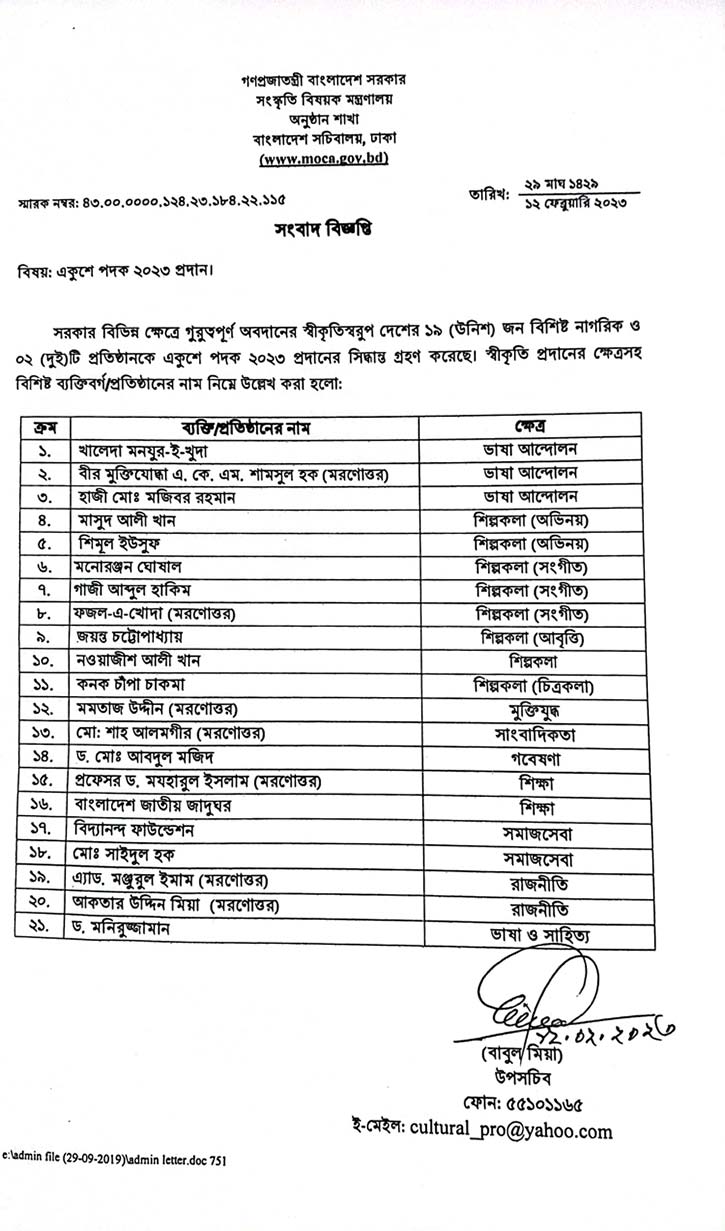 রোববার (১২ ফেব্রুয়ারি) সংস্কৃতিবিষয়ক মন্ত্রণালয়ের এক সংবাদ বিজ্ঞপ্তিতে এ তথ্য জানানো হয়েছে।