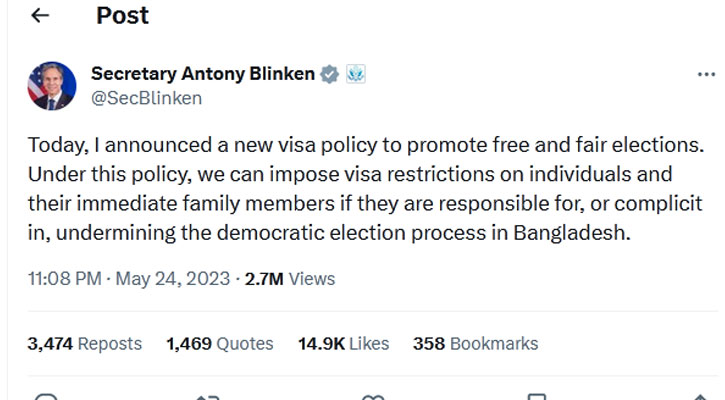 যুক্তরাষ্ট্রের পররাষ্ট্রমন্ত্রী ব্লিংকেনের ঘোষণা: বাংলাদেশে সুষ্ঠু নির্বাচনে বাধা দিলে ভিসা দেবে না যুক্তরাষ্ট্র