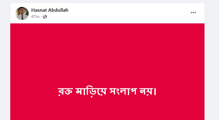 বৃহস্পতিবার (১৮ জুলাই) সরকারের পক্ষে সংলাপের আহ্বান আসার পর তাৎক্ষণিক প্রতিক্রিয়ায় সামাজিক যোগাযোগ মাধ্যমে সংলাপ না করার কথা জানান।