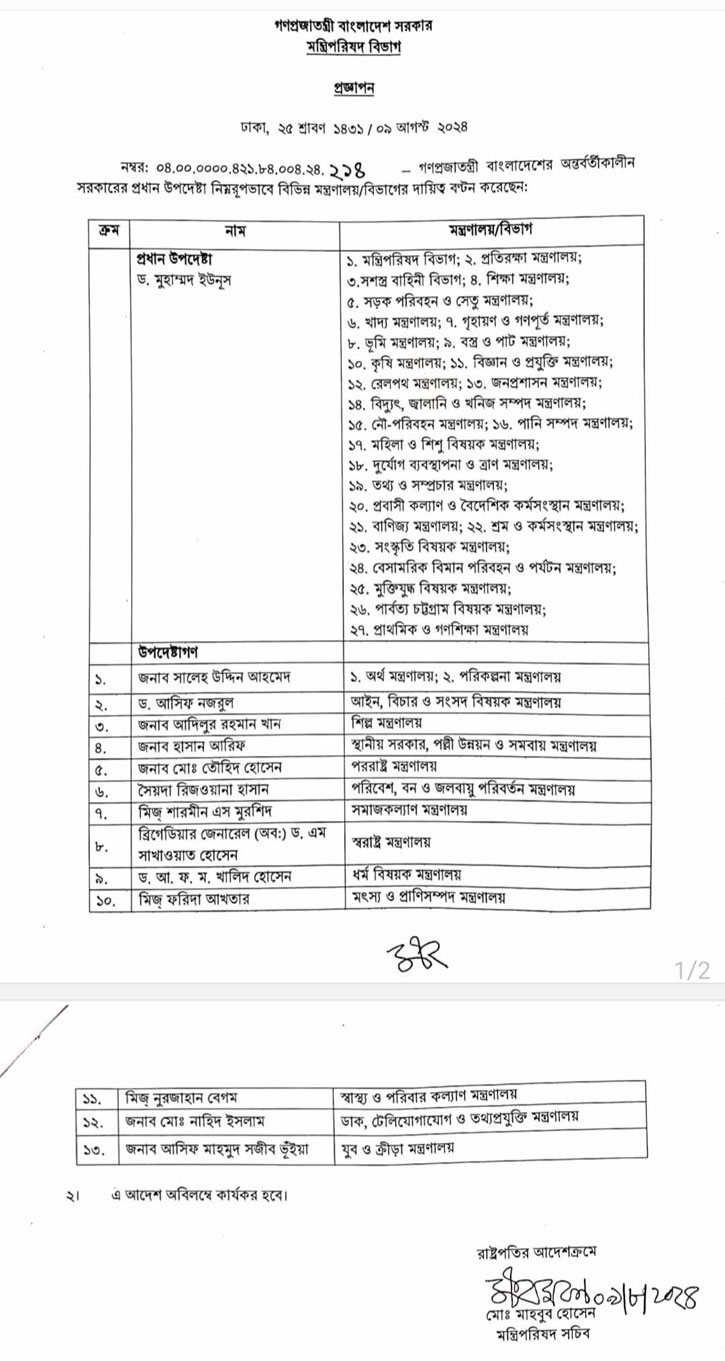 প্রজ্ঞাপন অনুযায়ী ২৭টি মন্ত্রণালয়ের দায়িত্বে রয়েছেন প্রধান উপদেষ্টা ড. মুহাম্মদ ইউনূস।