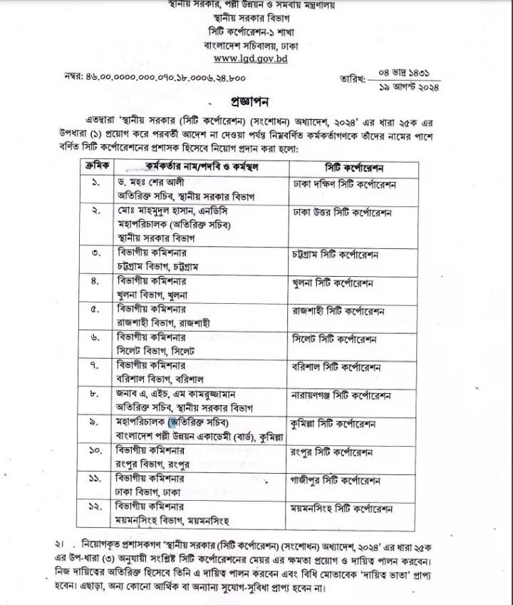 এতে বলা হয়, স্থানীয় সরকার (সিটি করপোরেশন) (সংশোধন) অধ্যাদেশ, ২০২৪-২৫ (ক) এর উপধারা (১) প্রয়োগ করে পরবর্তী আদেশ না দেওয়া পর্যন্ত ১২ কর্মকর্তাকে প্রশাসক হিসেবে নিয়োগ দেওয়া হলো।
