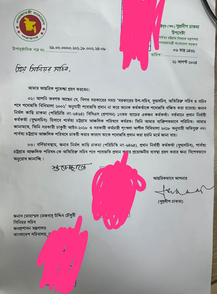 জনপ্রশাসন মন্ত্রণালয়ের সিনিয়র সচিবকে দেওয়া পত্রে তিনি লিখেছেন, বিগত সরকারের সময় ‘সরকারের উপ-সচিব, যুগ্মসচিব, অতিরিক্ত সচিব ও সচিব পদোন্নতি বিধিমালা ২০০২’ অনুযায়ী পদোন্নতি প্রদান না করে অনেক কর্মকর্তাকে পদোন্নতি বঞ্চিত করা হয়েছে। জনাব নির্মল কান্তি চাকমা (পরিচিতি নং-৬৪৬৫) বিসিএস প্রশাসন ক্যাডারের ১৭তম ব্যাচের একজন কর্মকর্তা। বর্তমানে প্রধান নির্বাহী কর্মকর্তা (যুগ্মসচিব) হিসেবে পার্বত্য চট্টগ্রাম আঞ্চলিক পরিষদে কর্মরত। তিনি আমার ব্যক্তিগতভাবে পরিচিত। আমার জানামতে, তিনি সরকারী