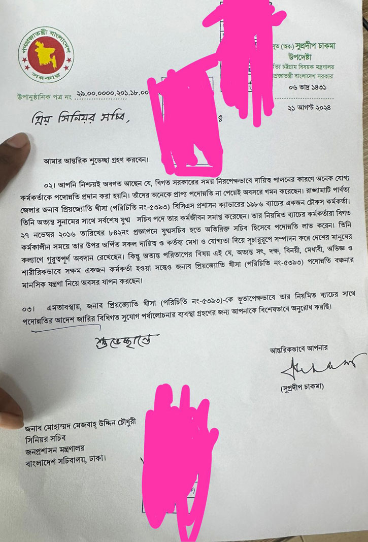 অপর আরেকটি উপানুষ্ঠানিক পত্রে এই উপদেষ্টা লিখেছেন, বিগত সরকারের সময় নিরপেক্ষভাবে দায়িত্ব পালনের কারণে অনেক যোগ্য কর্মকর্তাকে পদোন্নতি প্রদান করা হয়নি। তাদের অনেকে প্রাপ্য পদোন্নতি না পেয়েই অবসরে গমন করেছেন। রাঙ্গামাটি পার্বত্য জেলার জনাব প্রিয়জ্যেতি খীসা (পরিচিতি নং-৫৩৯৩) বিসিএস প্রশাসন ক্যাডারের ১৯৮৬ ব্যাচের চৌকস কর্মকর্তা। তিনি অত্যন্ত সুনামের সাথে সর্বশেষ যুগ্মসচিব পদে তার কর্মজীবন সমাপ্ত করেছেন। তার নিয়মিত ব্যাচের কর্মকর্তারা বিগত ২৭ নভেম্বর ২০১৬ তারিখের ৮৪২ নং প্রজ্ঞাপনে যুগ্মসচিব হতে অতিরিক্ত সচিব হিসেবে পদোন্নতি লাভ করেন। তিনি কর্মকালীন সময়ে তার উপর অর্পিত সকল দায়িত্ব ও কর্তব্য মেধা ও যোগ্যতা দিয়ে সুচারুরুপে সম্পাদন করে দেশের মানুষের কল্যাণে গুরুত্বপূর্ণ অবদান রেখেছেন। কিন্তু অত্যন্ত পরিতাপের বিষয় এই যে, অত্যন্ত সৎ, দক্ষ, বিনয়ী, মেধাবী, অভিজ্ঞ ও শারীরীকভাবে সক্ষম একজন কর্মকর্তা হওয়া সত্বেও জনাব প্রিয়জ্যেতি খীসা (পরিচিতি নং-৫৩৯৩) পদোন্নতি বঞ্চনার মানসিক যন্ত্রনা নিয়ে অবসর যাপন করছেন।