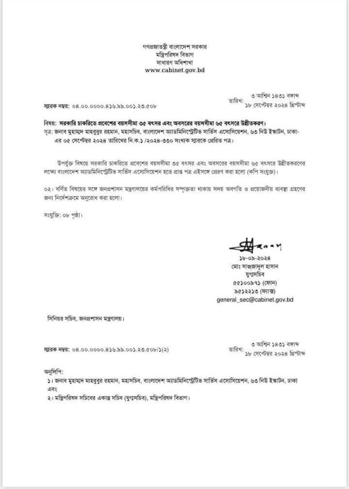 তিনি জানান, গত ৫ সেপ্টেম্বর বাংলাদেশ অ্যাডমিনিস্ট্রেটিভ সার্ভিস অ্যাসোসিয়েশনের মহাসচিব মুহাম্মদ মাহবুবুর রহমান চাকরিতে প্রবেশের বয়সীমা ৩৫ এবং অবসরের বয়সবৃদ্ধির দাবি জানিয়ে মন্ত্রিপরিষদ বিভাগে আবেদন করেন। সেই আবেদনটি বিবেচনায় নিয়ে প্রয়োজনীয় ব্যবস্থা নেওয়ার অনুরোধ জানিয়ে জনপ্রশাসন মন্ত্রণালয়ে পাঠানো হয়েছে।