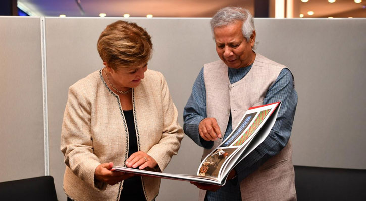 আইএমএফের ব্যবস্থাপনা পরিচালক ক্রিস্টালিনা জর্জিয়েভার সঙ্গে প্রধান উপদেষ্টা ড. মুহাম্মদ ইউনূস। ছবি: সংগৃহীত