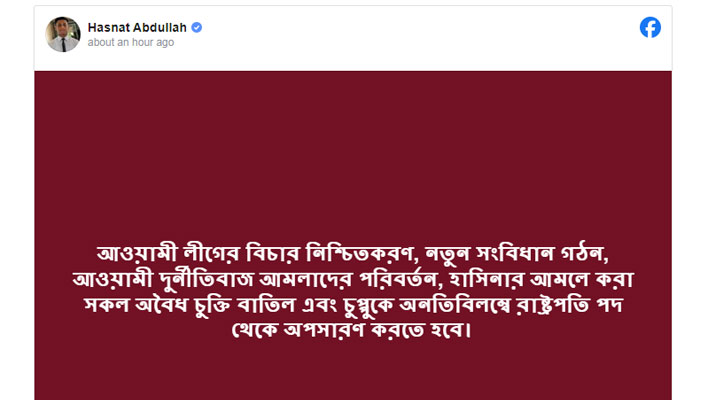 পোস্টে আওয়ামী লীগের বিচার ও দুর্নীতিবাজ আমলাদের পরিবর্তনসহ আরও বেশ কয়েকটি দাবি জানিয়েছেন হাসনাত আব্দুল্লাহ।