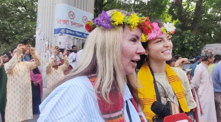 শোভাযাত্রায় আসা বিদেশিদের মধ্যে কেউ গলায় বাঁশি ঝুলিয়ে বাজাচ্ছেন, কেউ আবার লাল-সাদা শাড়ি-পাঞ্জাবিতে বাঙালিয়ানা সাজে সেজেছেন। বাঙালির ঐতিহ্যবাহী এই উৎসবে অংশ নিয়ে বিদেশি পর্যটকদের উচ্ছ্বাস প্রকাশ করতে দেখা গেছে।