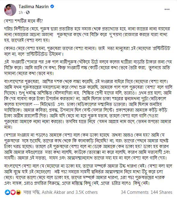 তিনি আরও লেখেন, ‘বাংলাদেশের পুরুষেরা, আশির দশক থেকে লক্ষ্য করেছি, এই সংজ্ঞার বাইরে গিয়ে মেয়েদের বেশ্যা বলে। আমি যখন পুরুষতন্ত্রের সমালোচনা করে লেখা শুরু করেছি, আমাকে পাল পাল পুরুষেরা ‘বেশ্যা’ বলে গালি দিয়েছে। শুধু ধর্মান্ধ অশিক্ষিত মৌলবাদীরা নয়, শিক্ষিত শ্রেণী যাদের বলি, তারাও। এখন প্রশ্ন হলো, আমি কি দেহ ব্যবসা করে টাকা উপার্জন করতাম? না, আমি ছিলাম ঢাকা শহরের স্বনামধন্য দুটো মেডিক্যাল কলেজ হাসপাতাল --- মিটফোর্ড এবং ঢাকা মেডিক্যালের সম্মানিত ডাক্তার।