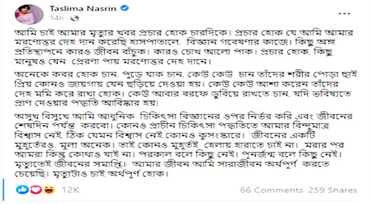 ঢাকা : নিজের মৃত্যু নিয়ে সামাজিক যোগাযোগ মাধ্যম ফেসবুকে নারীবাদী লেখিকা তসলিমা নাসরিন একটি স্ট্যাটাস দিয়েছে।