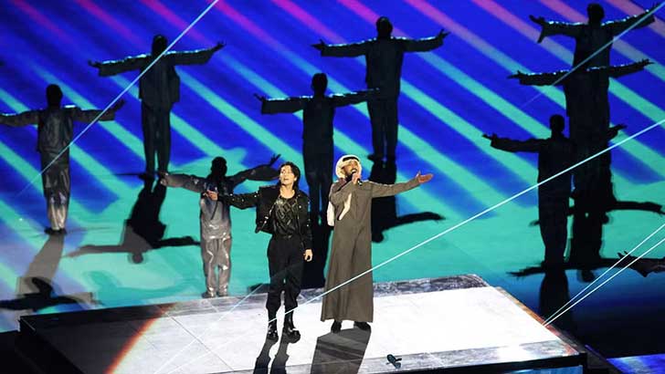 গান পরিবেশন করেন কোরিয়ান ব্যান্ড বিটিএস-এর গায়ক জং কুক। তার সঙ্গে পরে যোগ দেন কাতারের গায়ক ফাহাদ আল-কোবাইসি (বাঁয়ে)।