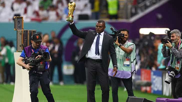 উদ্বোধনী অনুষ্ঠানের শুরুতে মাঠে বিশ্বকাপের ট্রফি নিয়ে এলেন ফ্রান্সের সাবেক ফুটবলার মার্সেল ডেসাইলি
