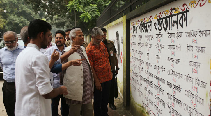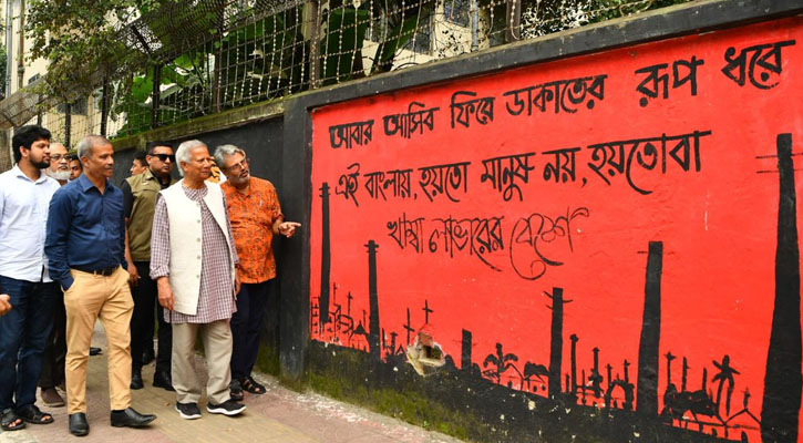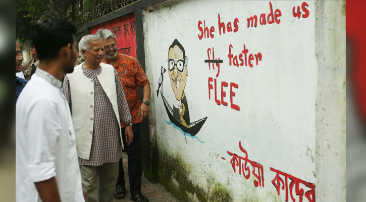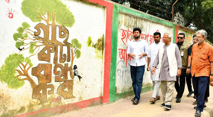 জুলাই ও আগস্টে ছাত্র-জনতার গণঅভ্যুত্থানকালে তরুণ বিপ্লবীদের আঁকা গ্রাফিতি দেখতে ঢাকা বিশ্ববিদ্যালয় ক্যাম্পাস পরিদর্শন করেছেন সরকারের প্রধান উপদেষ্টা অধ্যাপক মুহাম্মদ ইউনূস।