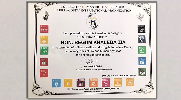 দি কানাডিয়ান হিউম্যান রাইটস ইন্টারন্যাশনাল অর্গানাইজেশনের পক্ষ থেকে খালেদা জিয়াকে দেওয়া সনদ