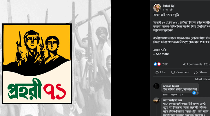 সবশেষে বাংলাদেশের প্রথম প্রধানমন্ত্রী পুত্র সোহেল তাজ লেখেন, ‘এটা একান্তই আমার নিজের উদ্যোগ। আপনারা কেউ যোগ দিতে চাইলে আসতে পারেন। আর না আসলে আমি একাই যাব-জয় বাংলা।’