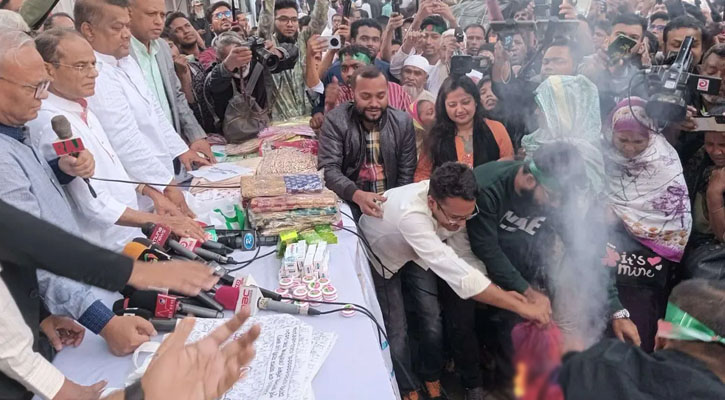 তিনি বলেন, একটি পুরোনো ভারতীয় শাড়ি আমার স্ত্রীর ছিল। সেই শাড়ি আমাকে দিয়েছে। এটা আজকে আপনাদের সামনে আমি ছুঁড়ে ফেললাম। আর কোনো ভারতীয় শাড়ি নয়। আমরা টাঙ্গাইলের শাড়ি পড়ব, আমরা রাজশাহীর সিল্ক পড়ব, আমরা কুমিল্লার খদ্দর পড়ব।
