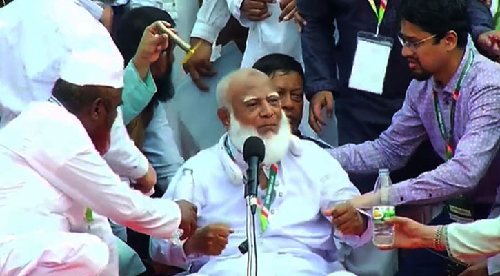 নেতাদের সহযোগিতায় কিছুক্ষণের মধ্যেই উঠে দাঁড়িয়ে জামায়াত আমির বলেন, ‘সবাই নিজ নিজ জায়গায় অবস্থান গ্রহণ করুন। আল্লাহ তাআলার শুকরিয়া আদায় করি আবার আপনাদের সামনে দাঁড়াতে পেরেছি। আমি বলেছিলাম, দুর্নীতিমুক্ত বাংলাদেশ আমরা সবাইকে নিয়ে গড়ব। আমরা কথা দিচ্ছি, আল্লাহর মেহেরবানি ও জনগণের ভালোবাসা নিয়ে জামায়াত যদি সরকার গঠন করে, তাহলে...।’ এ কথা শেষ করার আগেই আবারও অসুস্থ হয়ে তিনি ধীরে ধীরে নিচে বসে পড়েন। এ সময় মাইকে বলা হয়, আমিরে জামায়াত একটুখানি অসুস্থ হয়েছেন গরমের কারণে। কিন্তু তিনি বারবারই চেষ্টা করছিলেন বক্তব্য দেওয়ার জন্য। ডাক্তাররা বলছেন, তাঁর আর বক্তব্য রাখা ঠিক হবে না।