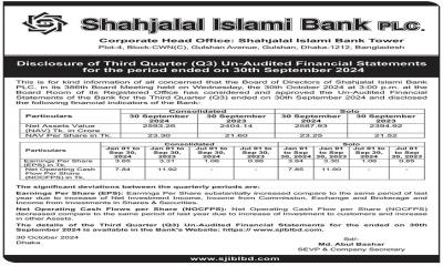 PSI of Shahjalal Islami Bank PLC regarding Disclosure of Third Quarter Un-Audited Financial Statements for the period ended on 30th September 2025