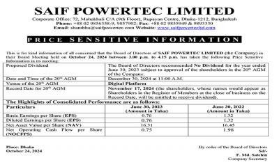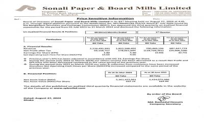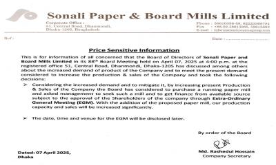 Price Sensitive Information: Sonali Paper & Board Mills Ltd