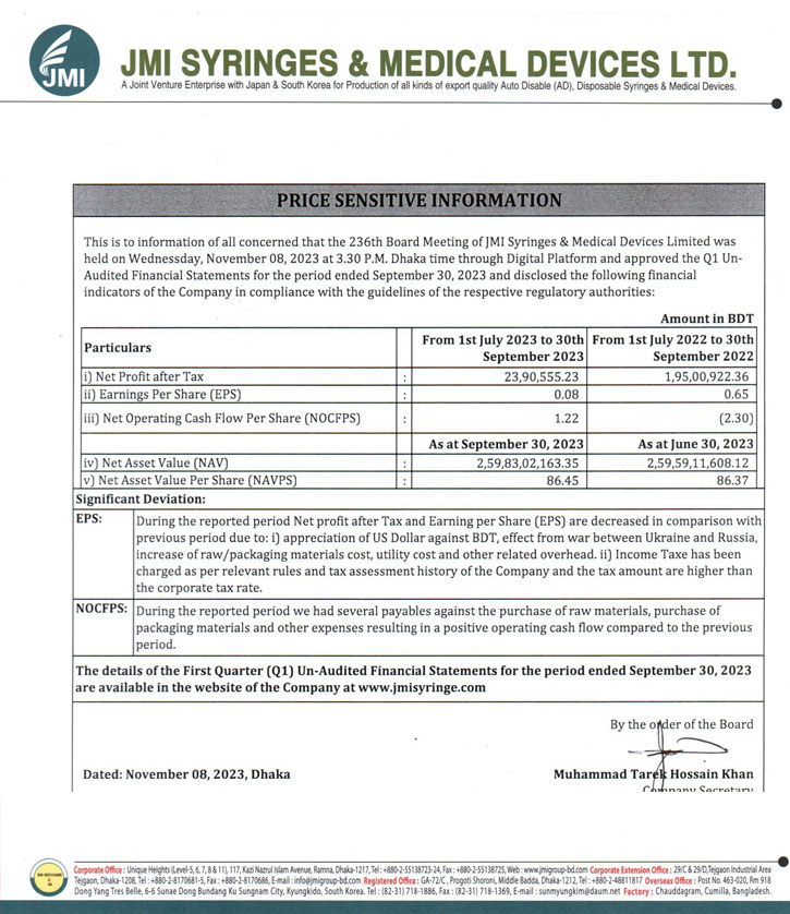Price Sensitive Information of JMI SYRINGES & MEDICAL DEVICES LTD.