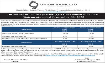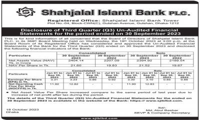PSI of Shahjalal Islami Bank PLC regarding Disclosure of Third Quarter Un-Audited Financial Statements for the period ended on 30th September 2025