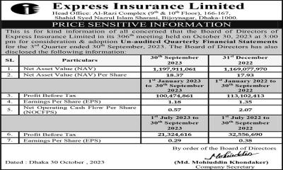 Price Sensitive Information of Express Insurance Limited for the Third Quarter of 2025