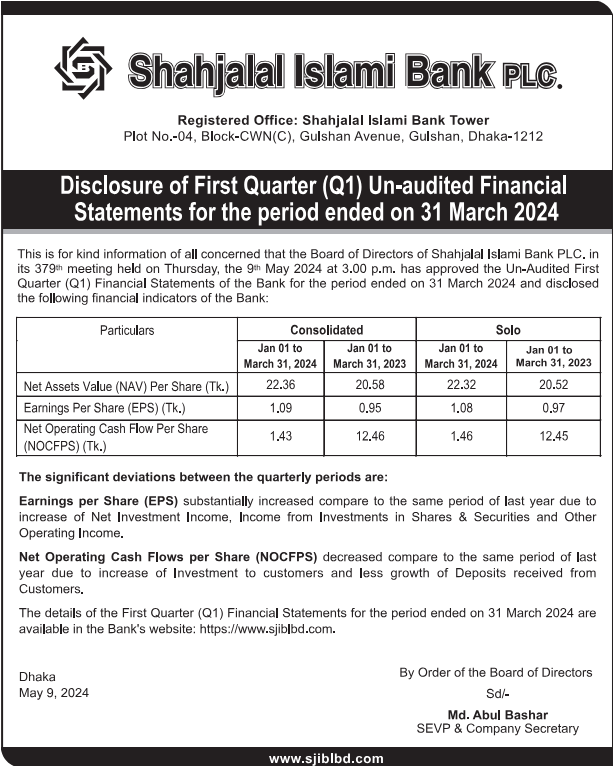 Shahjalal Islami Bank PLC: Disclosure of First Quarter (Q1) Un-audited Financial Statements for the period ended on 31 March 2024
