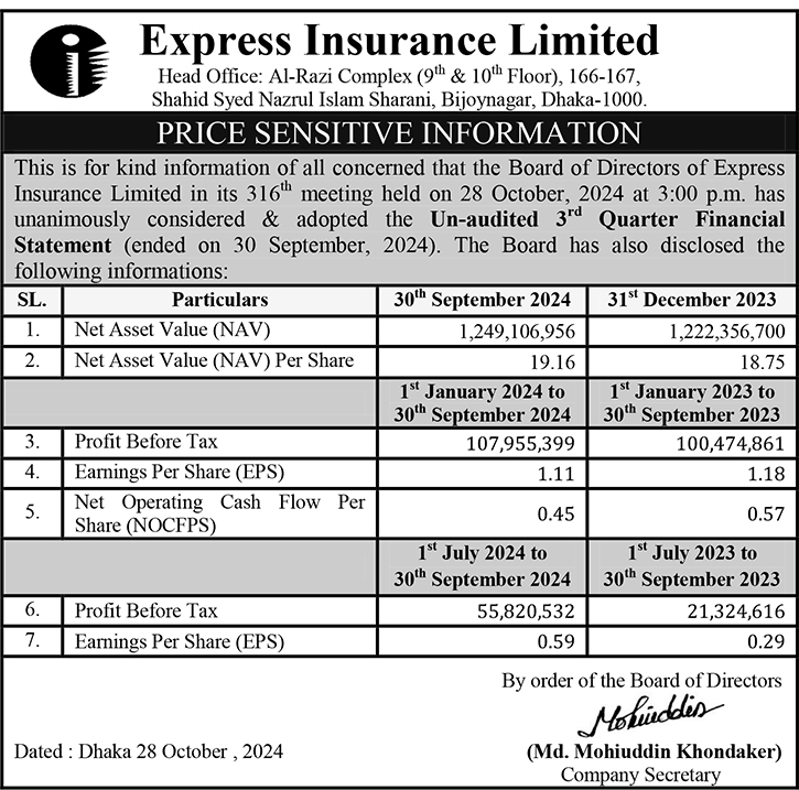 Price Sensitive Information of Express Insurance Limited for the Third Quarter of 2025