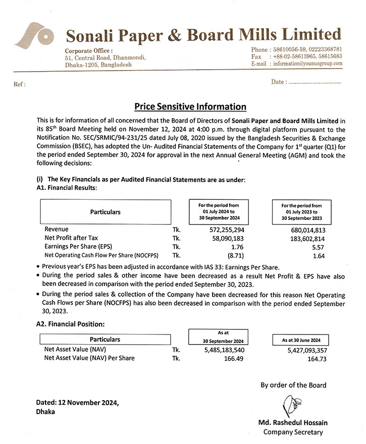 Price Sensitive Information: Sonali Paper & Board Mills Ltd