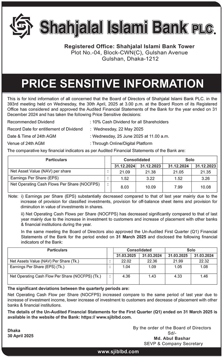 Price Sensitive Information : Shahjalal Islami Bank PLC.