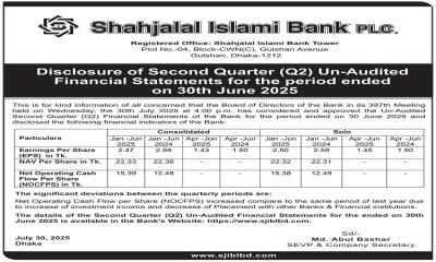 PSI of Shahjalal Islami Bank PLC regarding Disclosure of Second Quarter Un-Audited Financial Statements for the period ended on 30th June 2025