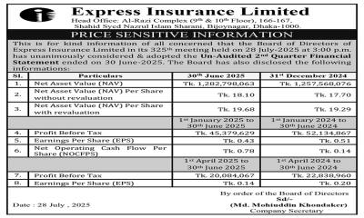 Price Sensitive Information of Express Insurance Limited for the 2nd Quarter of 2025
