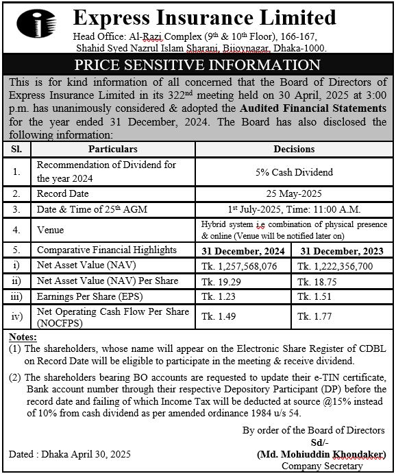 Price Sensitive Information of Express Insurance Limited for the 2nd Quarter of 2025