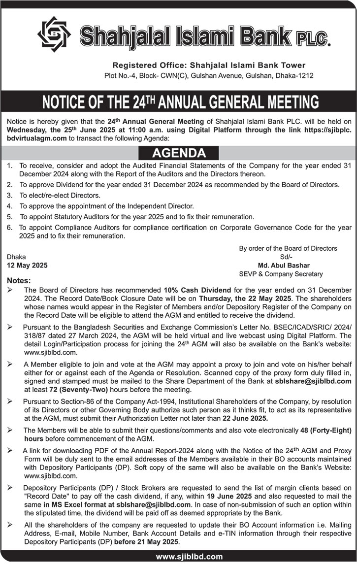 Notice of the 24th Annual General Meeting of Shahjalal Islami Bank PLC