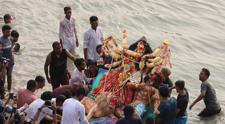 রোববার বেলা তিনটার পর মহানগর সার্বজনীন পূজা কমিটির নেতৃত্বে রাজধানীর পলাশীর মোড় থেকে বিজয়া শোভাযাত্রা বের হয়। আর সদরঘাটের ওয়াইজ ঘাটে প্রতিমা বিসর্জন দেয় ভক্তরা।
