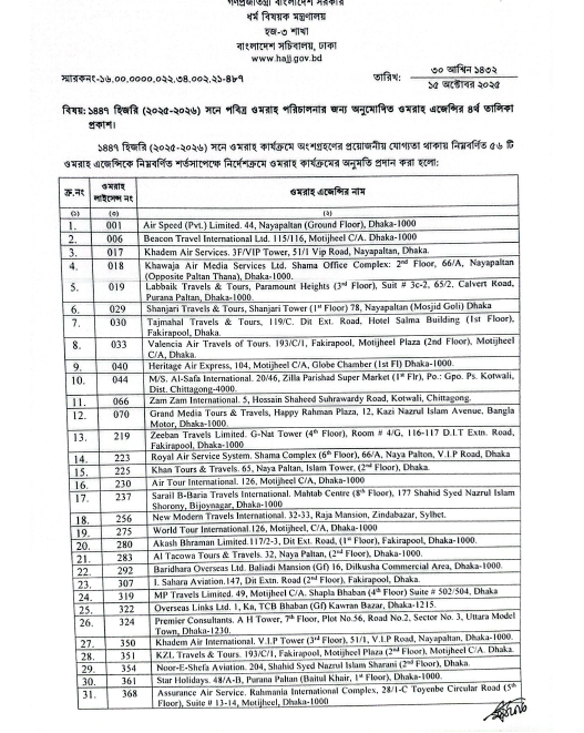 বৃহস্পতিবার (১৬ অক্টোবর) মন্ত্রণালয় থেকে এ তালিকা প্রকাশ করা হয়। এটি পবিত্র ওমরাহ পরিচালনার জন্য অনুমোদিত ওমরাহ এজেন্সির চতুর্থ তালিকা।