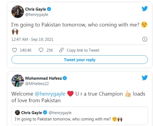 গেইলের টুইটে রিটুইট করেছে পাকিস্তান ক্রিকেট বোর্ডও (পিসিবি)। দেশটির ক্রিকেটার ও ক্রিকেট সংশ্লিষ্টরাও অংশ নিয়েছেন। টুইটটি গোটা ক্রিকেটবিশ্বে তোলপাড় সৃষ্টি করেছে। রিটুইটে অভিজ্ঞ পাক অলরাউন্ডার মোহাম্মদ হাফিজ লিখেছেন- তোমাকে স্বাগতম গেইল। তুমি সত্যিকারের চ্যাম্পিয়ন। পাকিস্তানের পক্ষ থেকে তোমাকে জানাই ভালোবাসা। পাক পেসার মোহাম্মদ আমির লিখেছেন- দেখা হবে কিংবদন্তি।